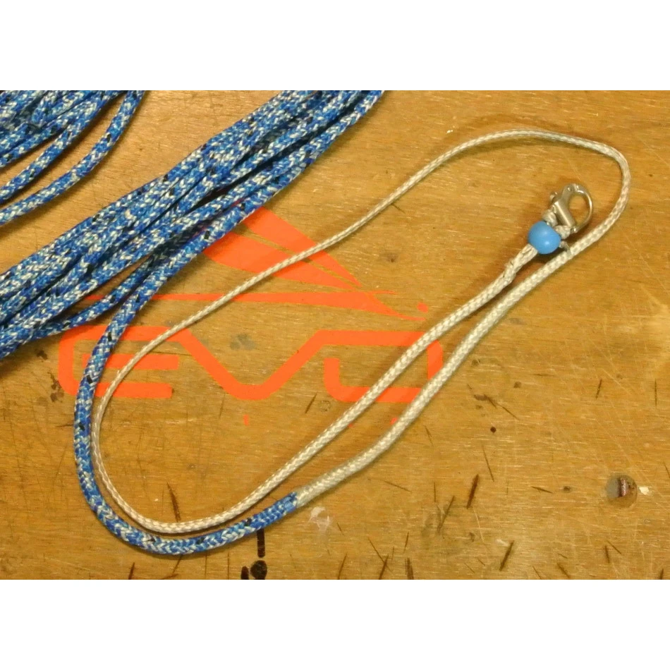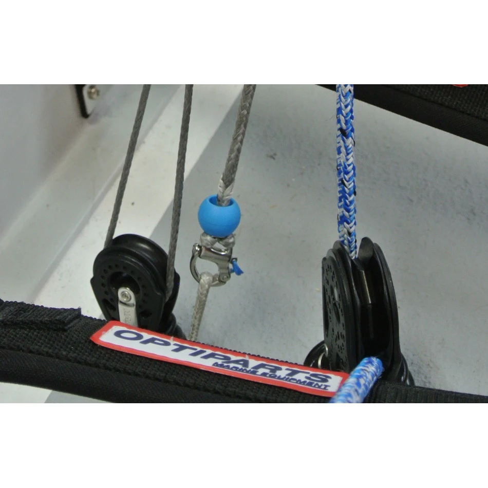 Ce système permet d’accrocher et décrocher facilement le palan d’écoute de la bôme de L’Optimist.