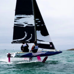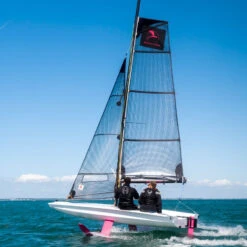 Une fois en vol, le Skeeta se comporte comme les foilers les plus performants. Sa forme de carène inspirée des Scows, courte et large, sera très appréciable lors des passages délicats comme les virements et empannages plus ou moins bien maitrisés.
